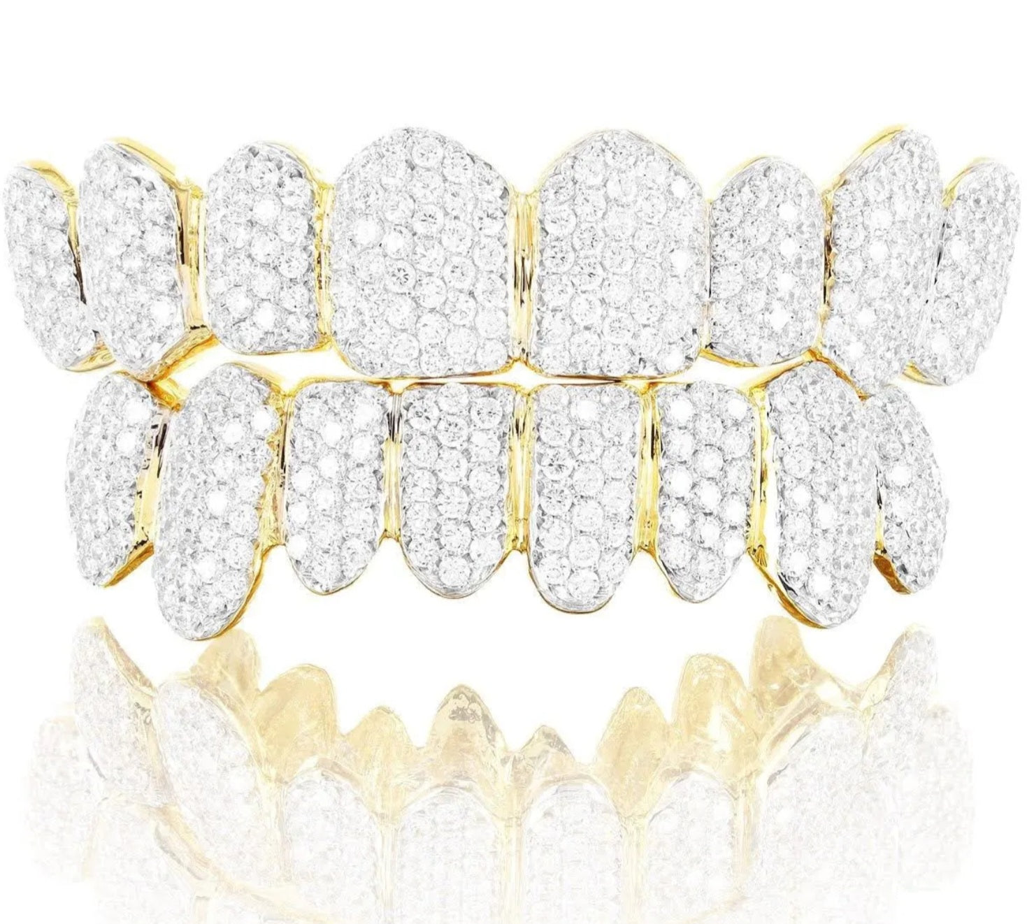 PRICE PER TOOTH. Your choice of natural Vs1 E/G color diamonds, vvs1 flawless lab diamonds, and VVs1 D color moissanite stones. Our honeycomb setting is flawless, and we set over 380 1.5mm stones in brand new gold never scrap. Gold karat purity available in 10k, 14k, 18k, and even sterling silver. FREE MOLD KIT AND SHIPPING FOR ALL ORDERS. ONCE WE RECIEVE YOUR ORDER WE WILL SEND YOU A TEXT OR EMAIL TO CONFIRM DESIRED TOOTH POSITION.
